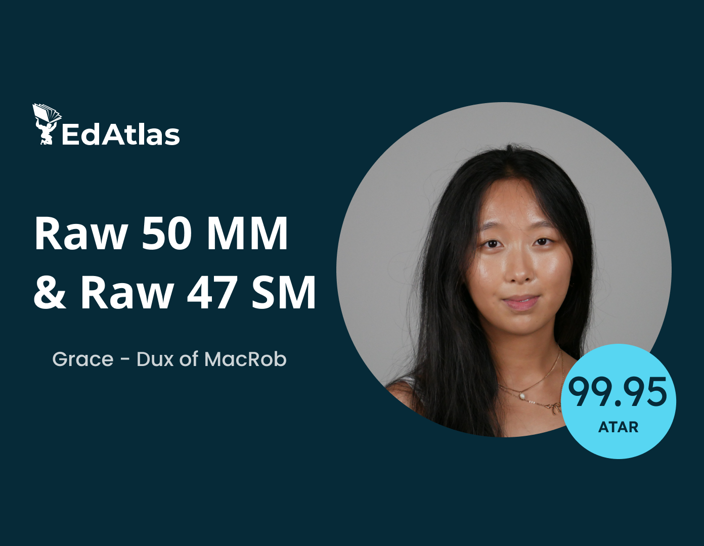 Grace, Dux of MacRob (2025), 99.95 ATAR, Raw 50 Methods, Raw 47 Specialist Maths