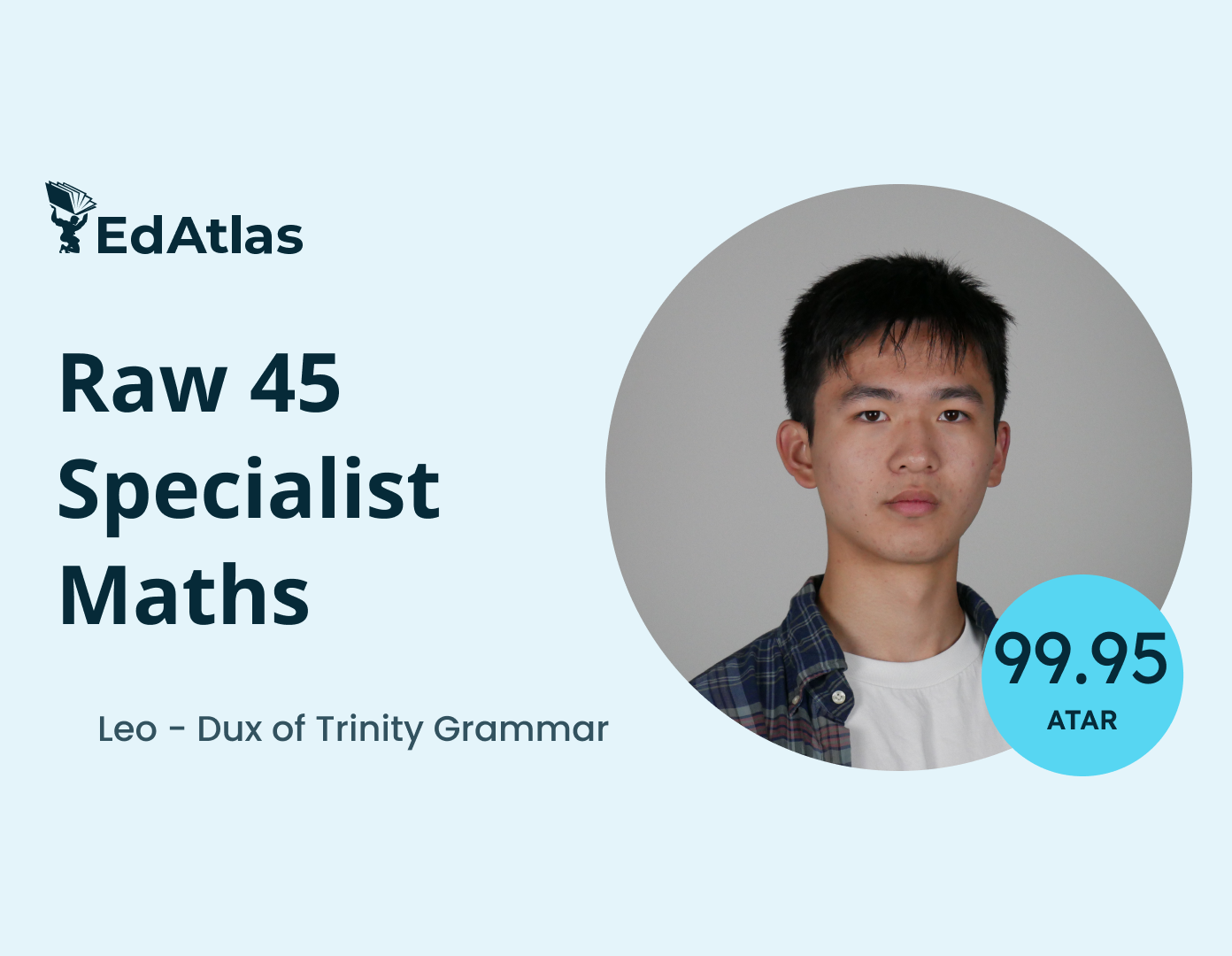 Leo, Dux of Trinity Grammar (2025), 99.95 ATAR, Raw 45 Specialist Maths