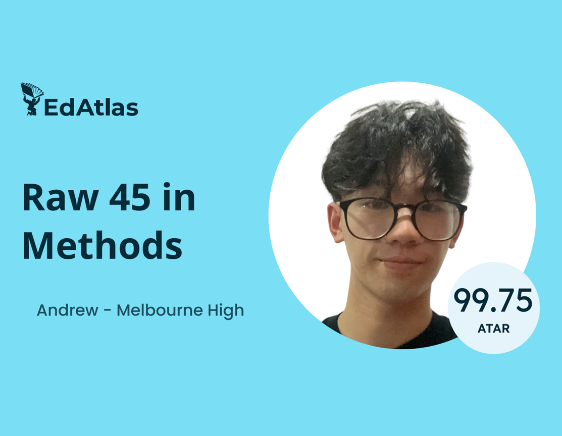 Andrew, Melbourne High School, 99.75 ATAR, 45 raw Methods, 43 raw Specialist