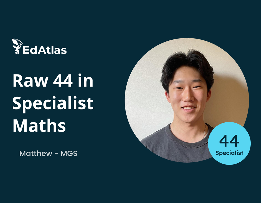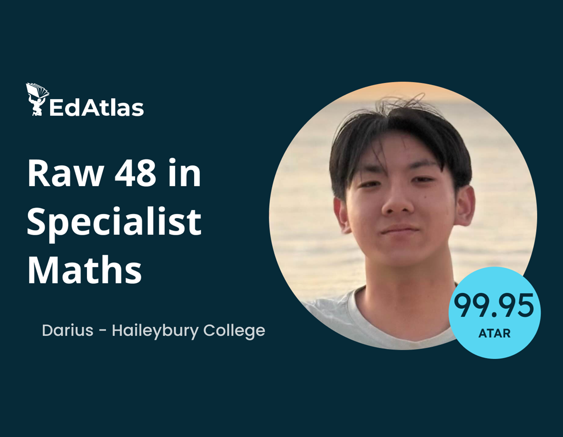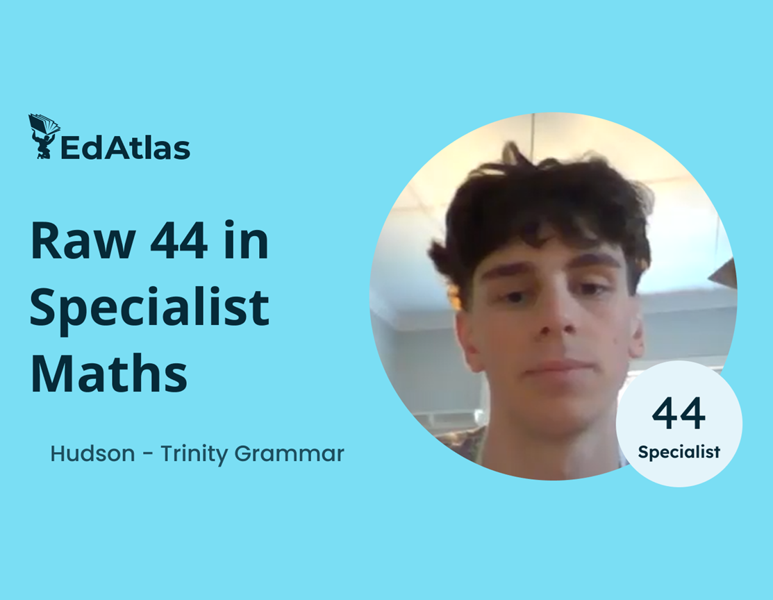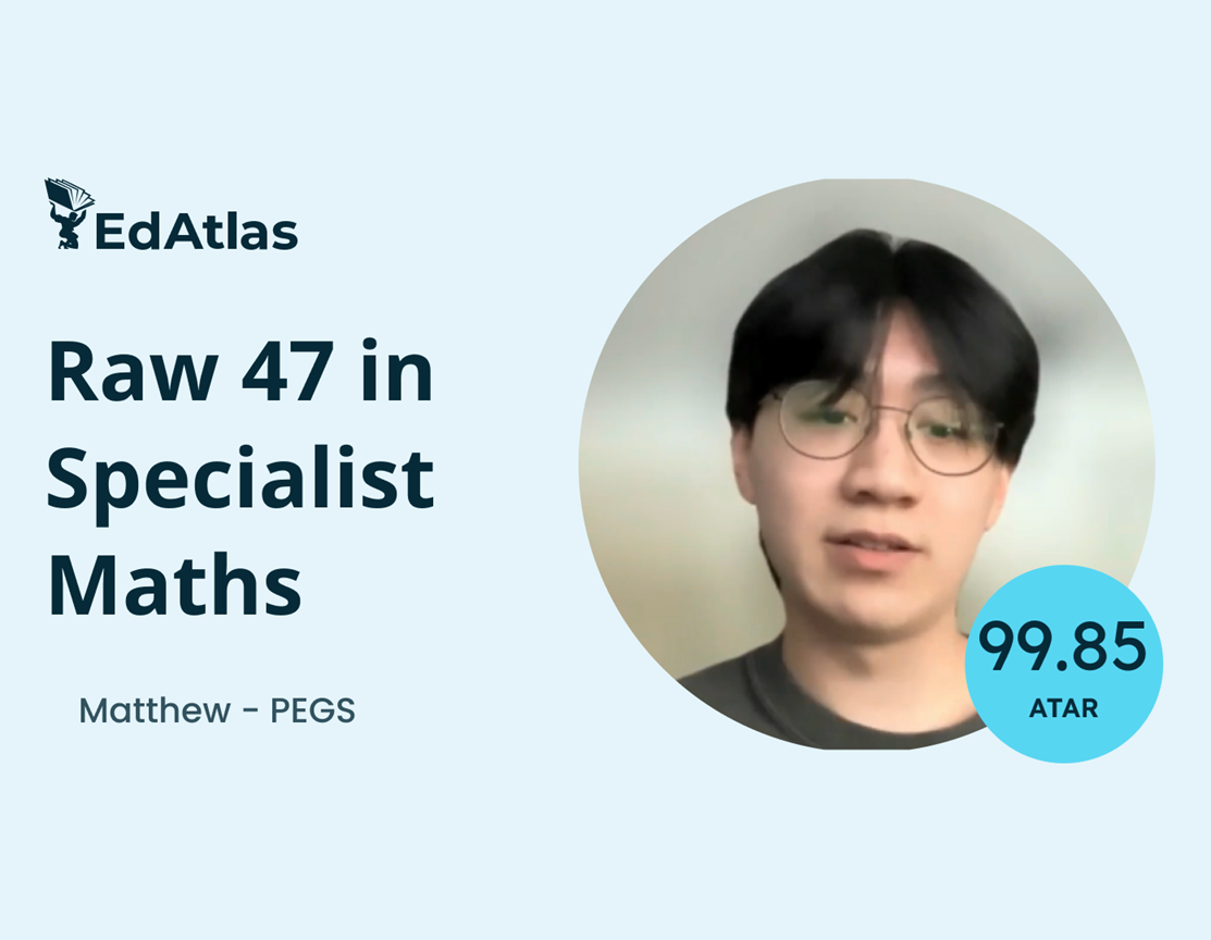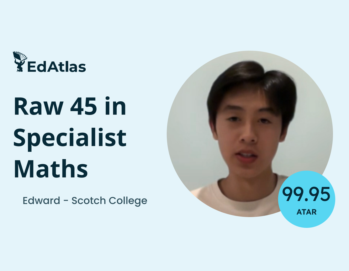 “Going into Year 12, my goal was just to get a 40 raw in Spesh – I didn’t really expect to get 47 – I was kind of shocked. If I hadn’t gone to EdAtlas, I definitely would not have gotten that. I think working with Rob allowed me to get the score that I did in Spesh and that translated into getting the ATAR that I didn’t really think I was going to get. I think what really differentiates EdAtlas from other tutoring companies is that he really cares about his students. No matter your mathematical ability, he puts time into getting to know every student. The support you get is much better than other tutors [I went to]”