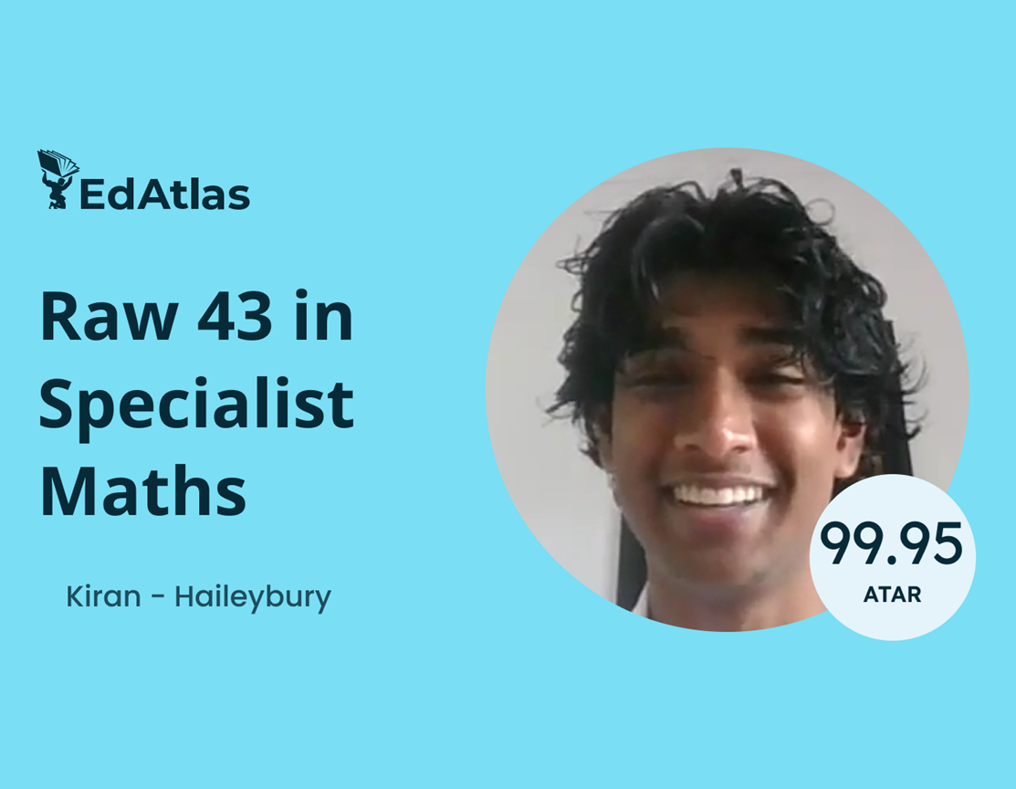 “Working with Rob very largely contributed to my ATAR – without him it would not have been possible to get my 99.95. I think that Rob in particular pushed me to aim for something above a 50 [scaled]. One of my biggest memories at EdAtlas was when Rob had this chat about study skills – about how we should behave and live our lives and habits outside of simply Specialist Maths – for me this was something that really stood out – because Rob was looking out for how we did, our whole VCE and ATAR experience as opposed to just Specialist Maths – this was something that made EdAtlas really stand out from other tutors.”