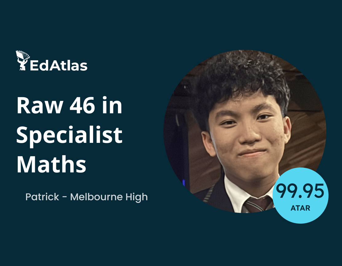 Patrick, Dux of Melbourne High School, 99.95 ATAR, 47 raw Methods, 46 raw Specialist